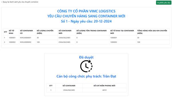 Sau khi được cán bộ công chức duyệt, doanh nghiệp có thể chọn nút “In phiếu yêu cầu chuyển tàu” để in ra phiếu