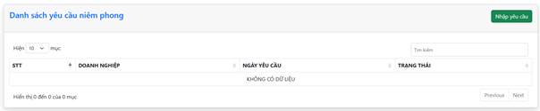 Doanh nghiệp chọn “Yêu cầu niêm phong container” trong thanh điều hướng và chọn nút “Nhập yêu cầu”