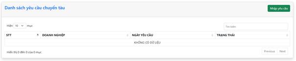 Doanh nghiệp chọn “Yêu cầu chuyển tàu” trong thanh điều hướng và chọn nút “Nhập yêu cầu”