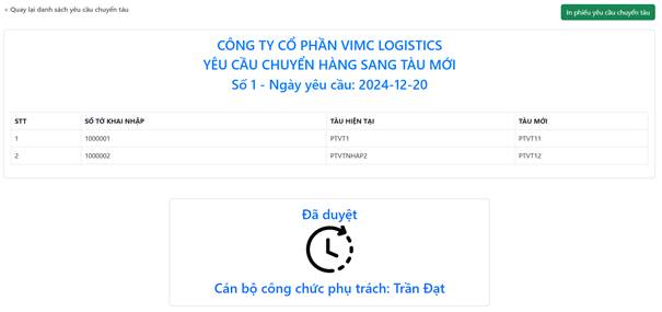 Sau khi được cán bộ công chức duyệt, doanh nghiệp có thể chọn nút “In phiếu yêu cầu chuyển tàu” để in ra phiếu